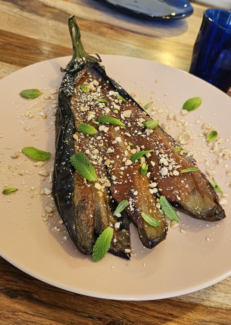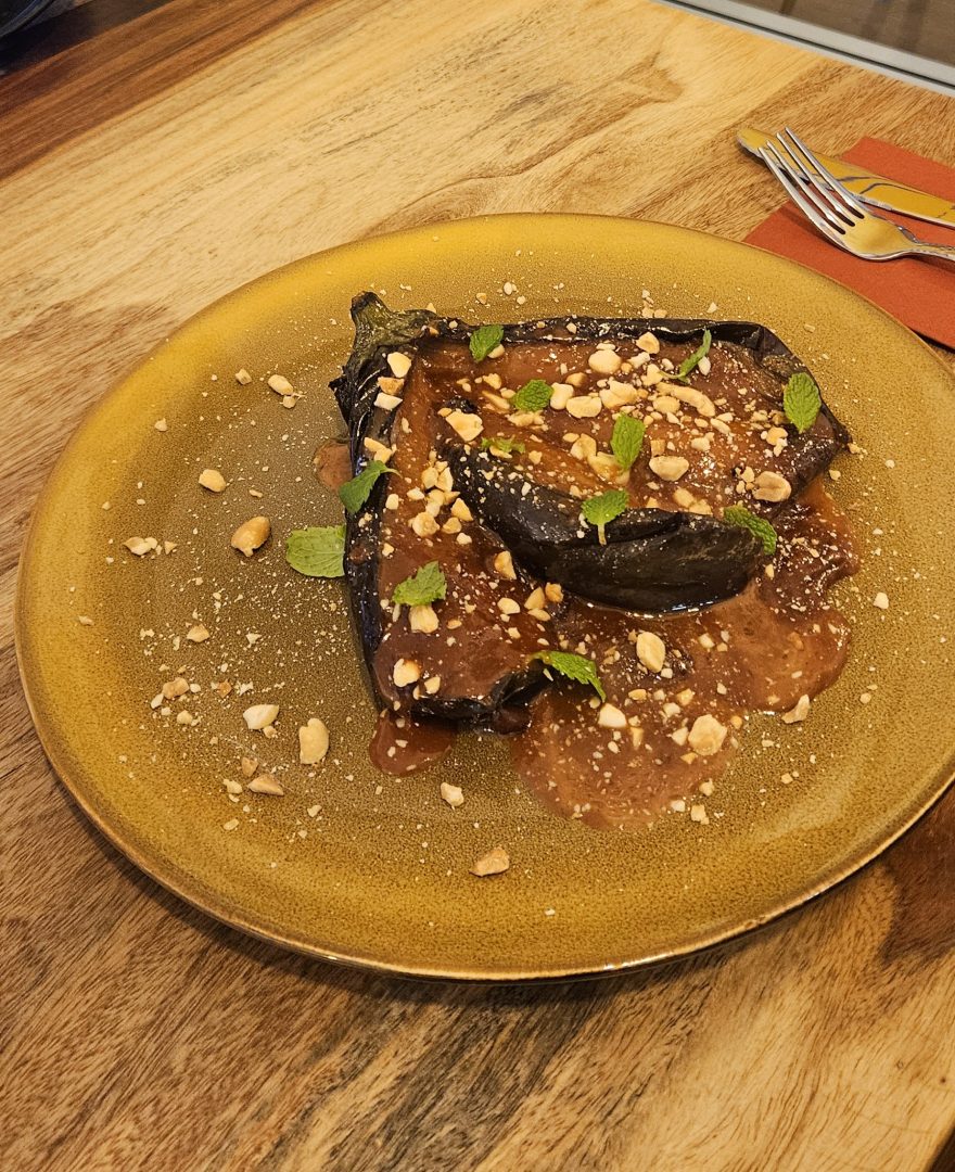 Berenjena confitada con salsa de maní tostado