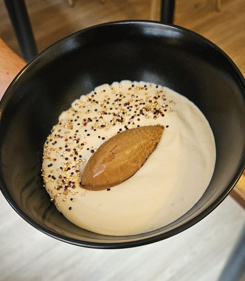 Mazamorra de almendra, quinoa inflada y granizado de tamarindo